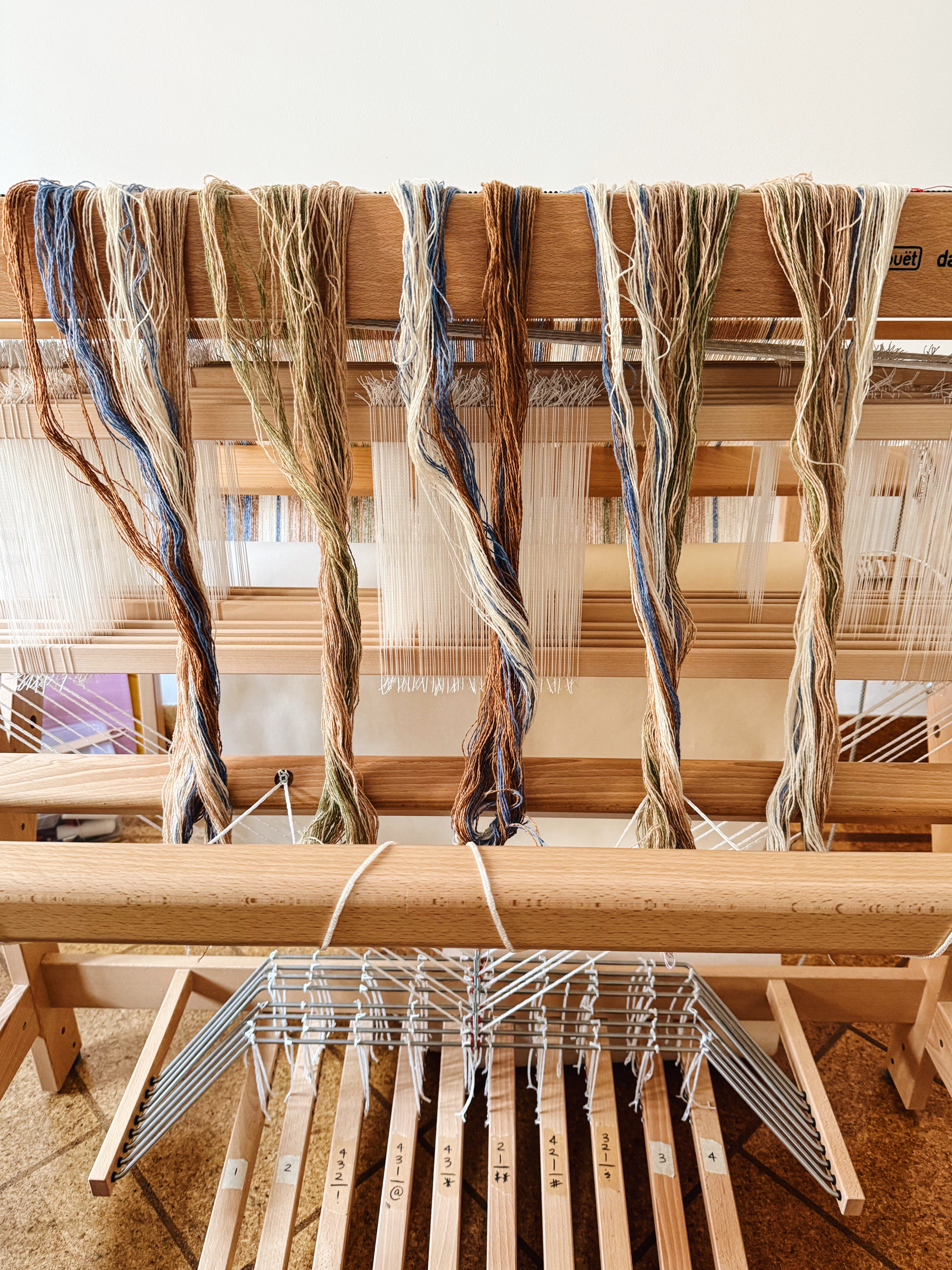 Then, there’s the process of getting it all on the loom. I spent a very relaxing week between Christmas and New Year’s winding the warp and threading the loom. There’s something very soothing about slowly unraveling and re-raveling yarn, threading 600 heddles, and tying on each of the ends.
